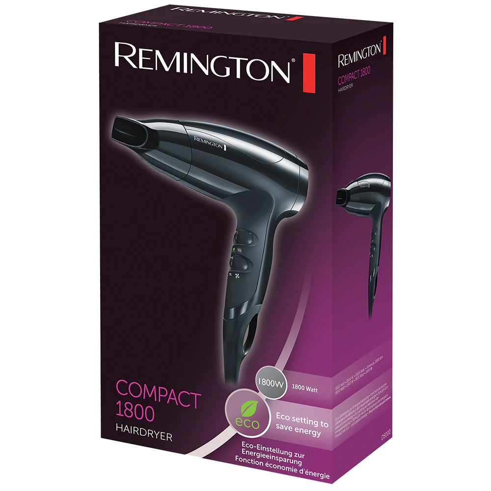 The Remington Compact 1800W D5000 Hair Dryer is a straightforward and energy-efficient hair drying tool. With its compact design and eco setting, it offers both convenience and the option to reduce energy consumption during your hair styling routine.